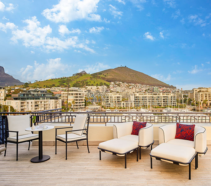 Our Waterfront Penthouse features a luxurious one-bedroom layout with a private terrace and Jacuzzi, perfect for couples or anyone seeking ultimate privacy. The timeless décor extends to a separate lounge and dining area, complemented by a spacious balcony and walk-in terrace. Enjoy stunning views of the V&A Waterfront, including views of either the working harbour, or the yacht marina and mountain.